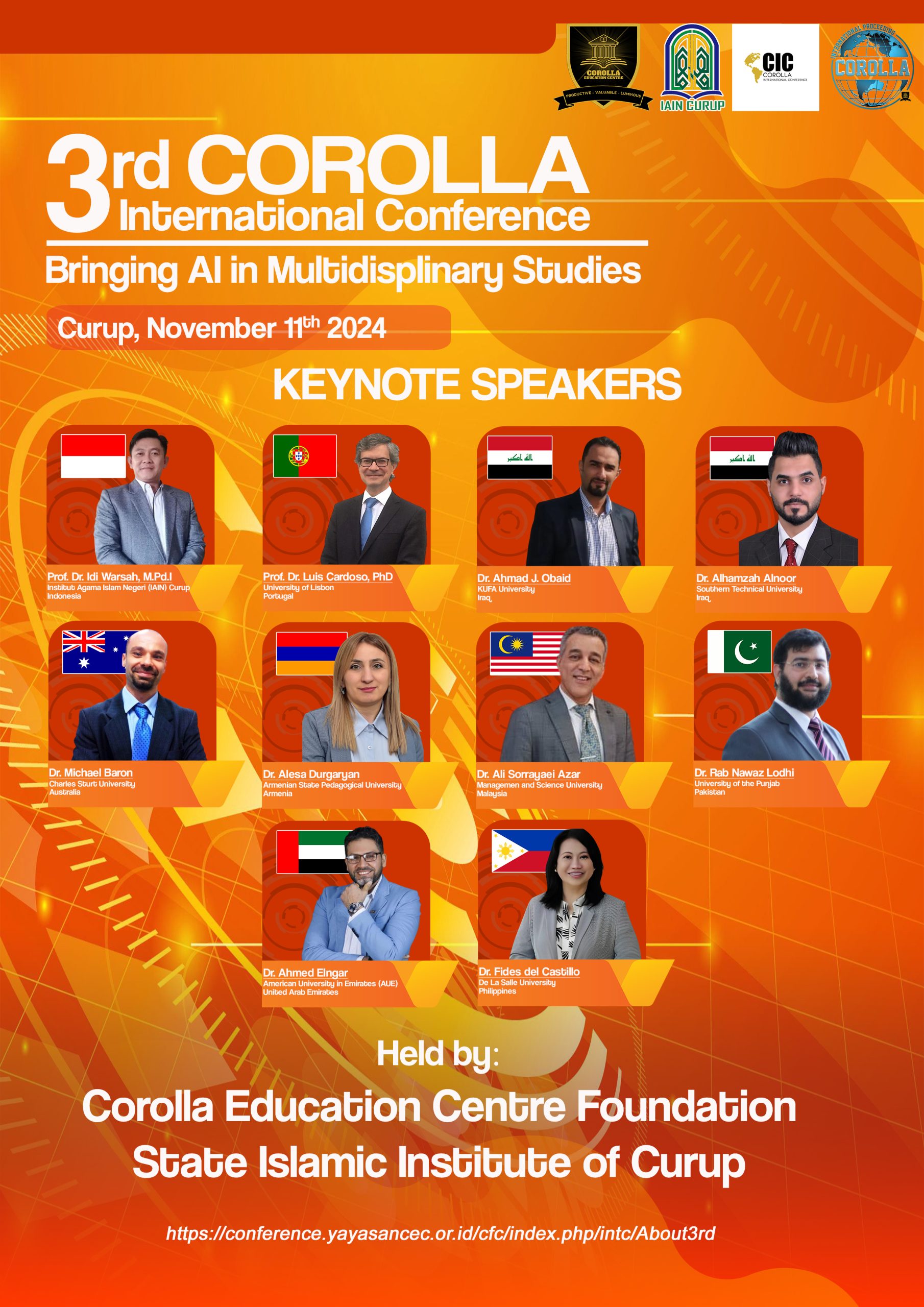 Corolla International Conference Proceeding (e-ISSN: 2985-6965) is the output of International Conference organized by Corolla Education Centre Foundation. The aim of this conference is to gather all schoolers, academics, researchers, lecturers, teachers, and students to share ideas, experiences, and research findings in the fields of future education in the world viewed. This proceeding is published in December in every year. This proceeding is already indexed by Google Scholar. The editors and reviewers of this proceeding come from more than 16 countries who experts in their field, namely Albania, Bahrain, Bangladesh, Croatia, Egypt, India, Indonesia, Kosovo, Luxembourg, Malaysia, Pakistan, Palestine, Philippines, República Dominicana, Saudi Arabia, and United Kingdom.